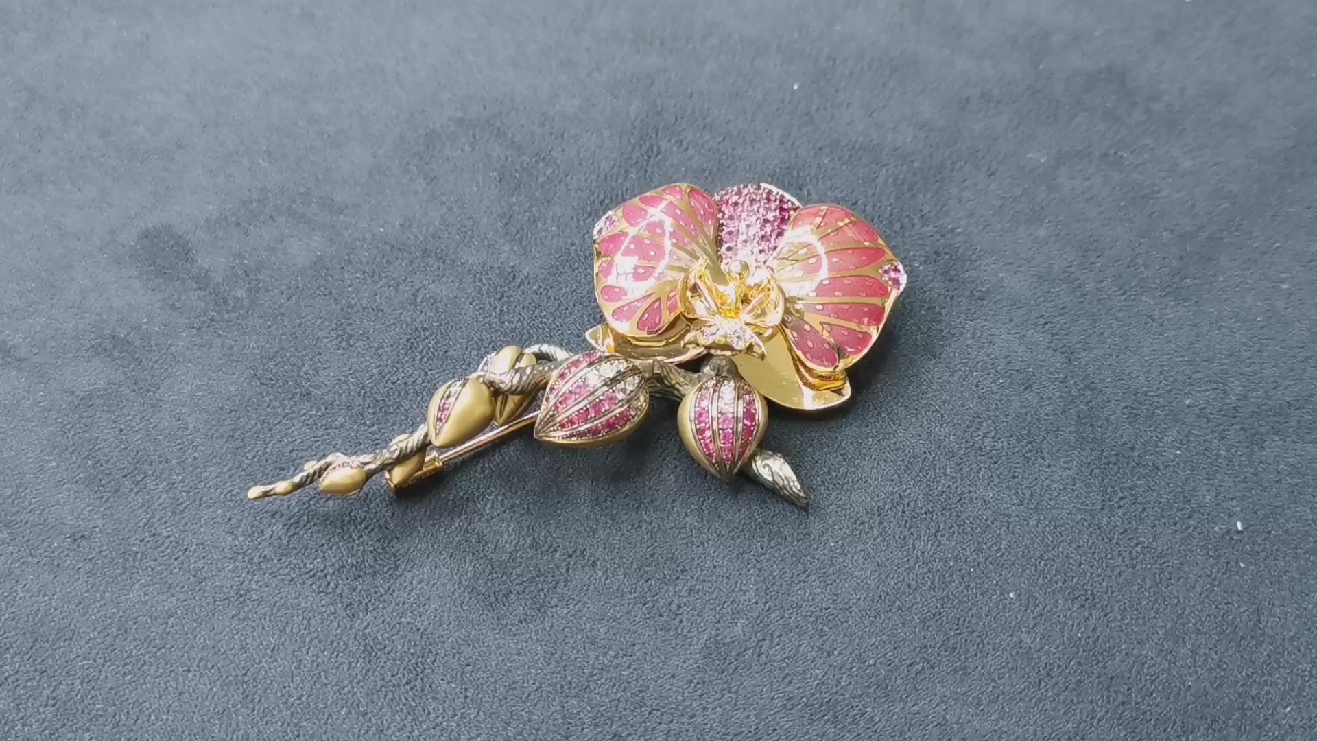 Orchids have a long history, and this is one of the most perfect creations of nature, and it is not without reason that many call them "aristocrats" among plants. Take a look at our orchid. This Brooch is made of 18 Karat Yellow Gold, 122 Pink Sapphires weighing 3.24 Carat, Diamonds and Enamel. Please draw your attention to the incredible smoothness of lines and similarity with the original. Just a piece of art!