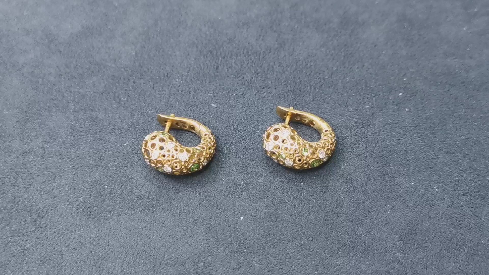 Instantly beautify any outfit with our 18K gold earrings! Featuring tsavorite garnets, diamonds, and a stunning gold design, these earrings are perfect for any occasion. From our Bubbles Collection, these earrings are light and airy, with small bubbles adorned with tsavorites and diamonds.