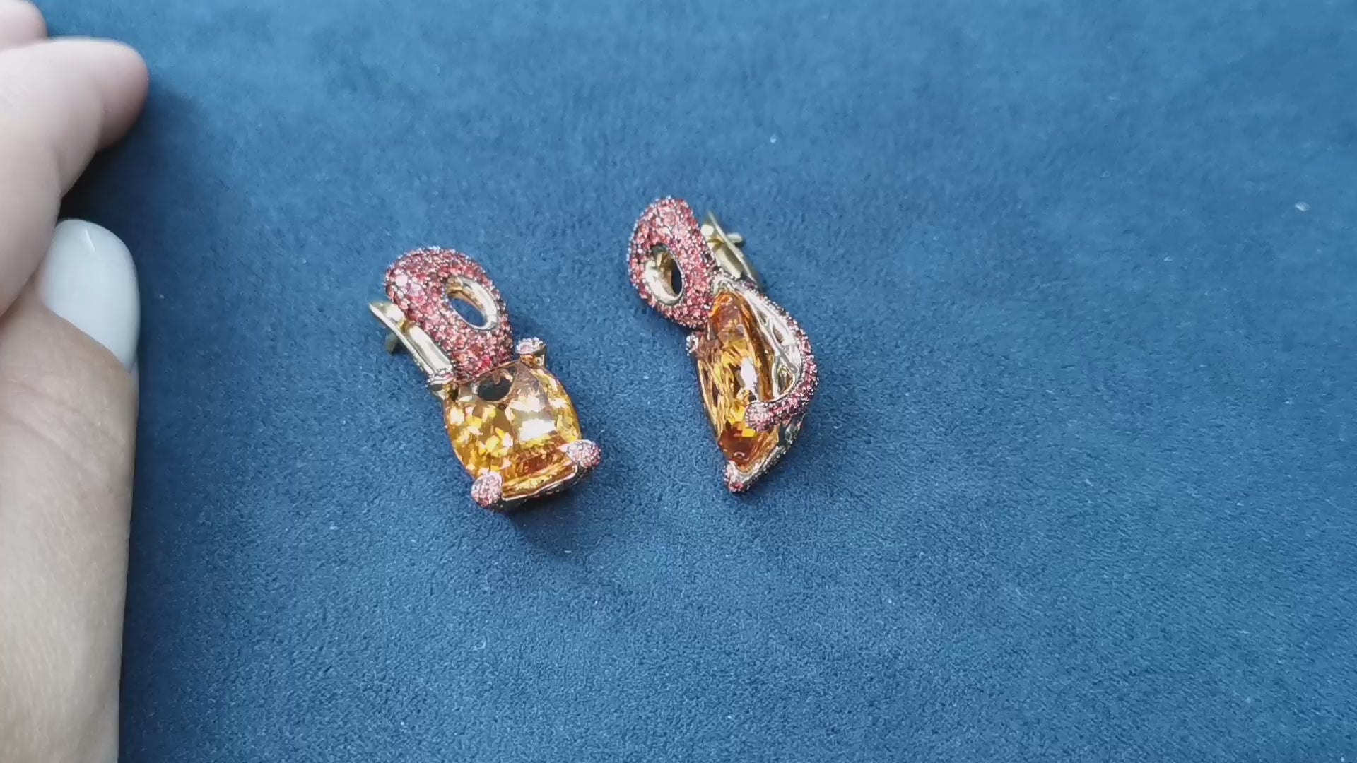 At the forefront are a pair of Citrines and stunning Orange Sapphires, resting on top of an 18K Yellow Gold base with sleek black rhodium accents. The dynamic juxtaposition of textures and gemstones creates a captivating showcase, and the soft color scheme radiates a charming allure.
