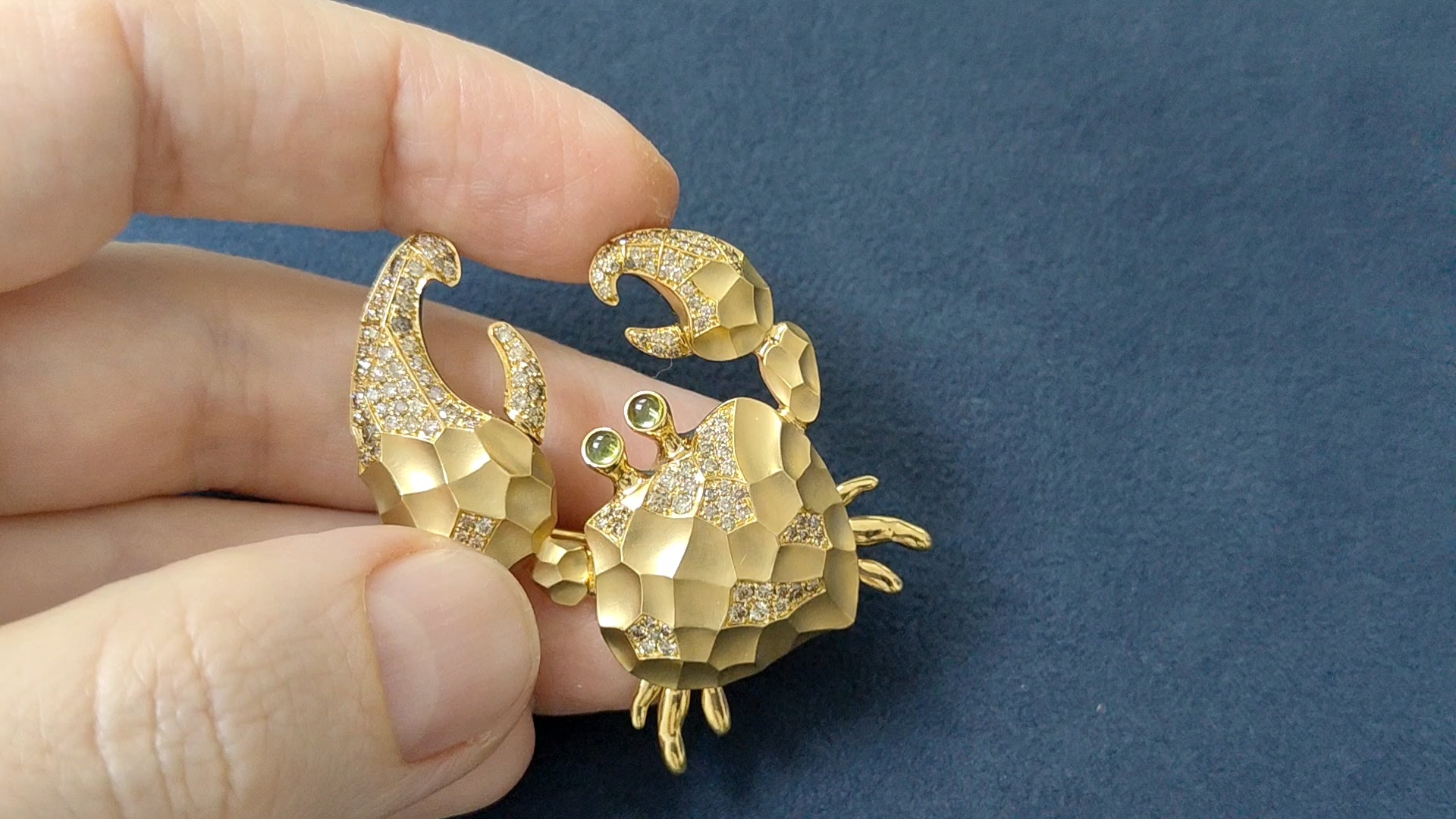 Champagne Diamonds, Tourmaline 18K Yellow Gold Crab Brooch, Brs 0247-0