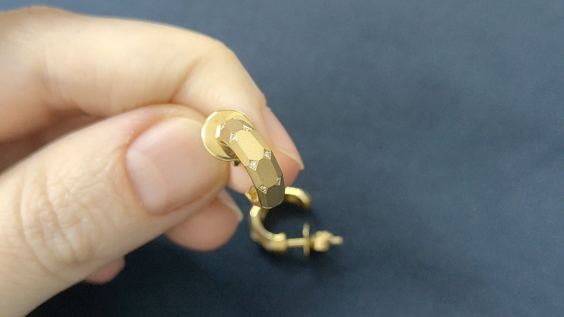 We present to your attention our "Geometry" Collection - the kingdom of perfectly straight lines. All products from this collection are interconnected by a sharp, angular, often minimalistic shape with regular straight lines arranged chaotically. Real cubism in jewellery! For example, these Earrings! Made in Yellow 18 Karat Matte Gold, and in the corners of clear geometric lines set 24 Diamonds.