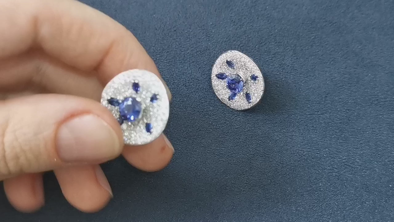 Elegantly crafted in 18K white gold, these earrings offer a timeless design with stunning round sapphires at their center. The main gems are beautifully complemented by 10 marquise-shaped sapphires and adorned with 278 sparkling white diamonds, creating a sophisticated piece that radiates luxury and refinement.