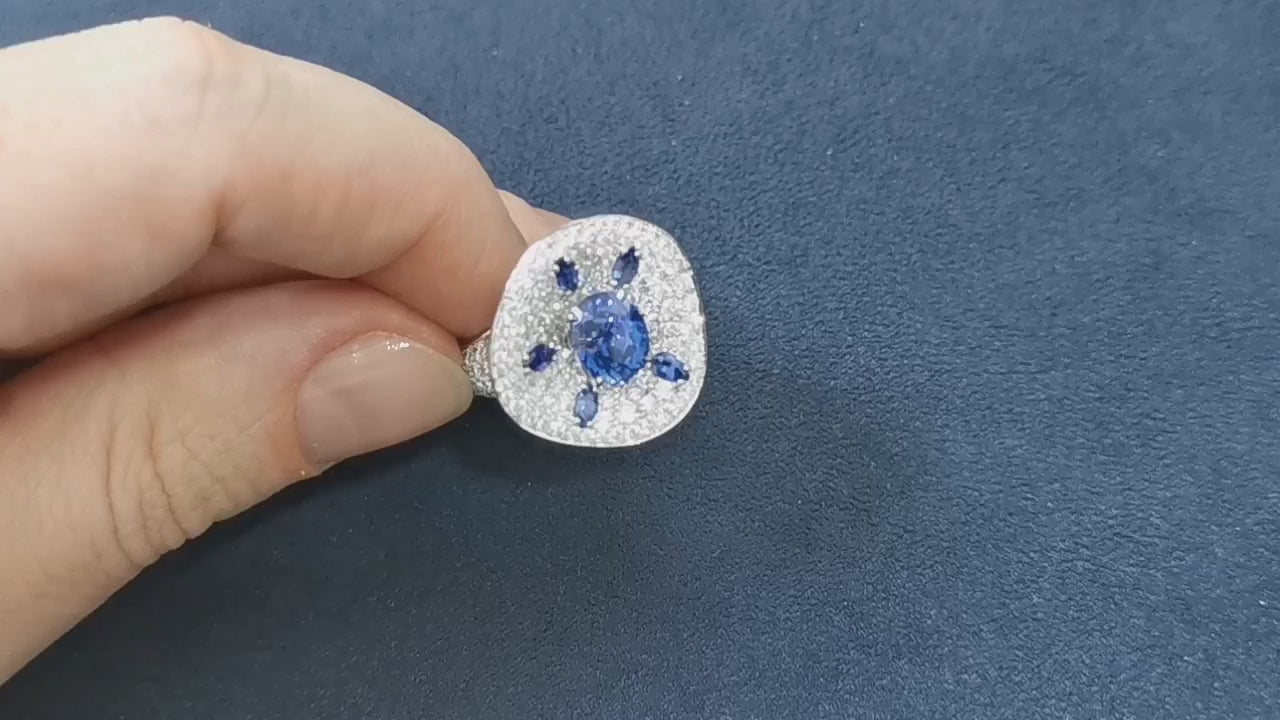 This stunning ring features a combination of sapphires and diamonds, making it a winning choice. It boasts a central oval-shaped sapphire, accented by 5 marquise-shaped sapphires and 188 sparkling white diamonds. Meticulously crafted in luxurious 18K white gold, this exquisite piece showcases exceptional artistry and attention to detail. The deep blue sapphires create a captivating contrast against the brilliant diamonds, enhancing the ring's elegant silhouette. Perfect for special occasions or as a treasured heirloom, this sophisticated design offers timeless beauty that will complement any jewelry collection. The secure setting ensures both comfort and durability for everyday wear.
