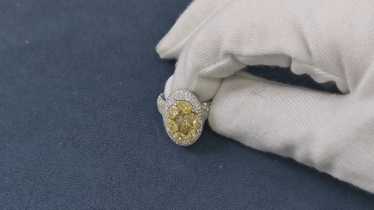 This beautiful ring featuring a 6 Pear and Oval shape Fancy Yellow Diamond center, plus 73 small Yellow Diamonds, is set in 18K Yellow Gold and graced with 298 Diamonds and bright yellow Enamel for a total of 2.32 Carats - set in to 18K White Gold. This striking Ring boasts an elegant, ethereal look and is a perfect addition to any jewelry collection.
