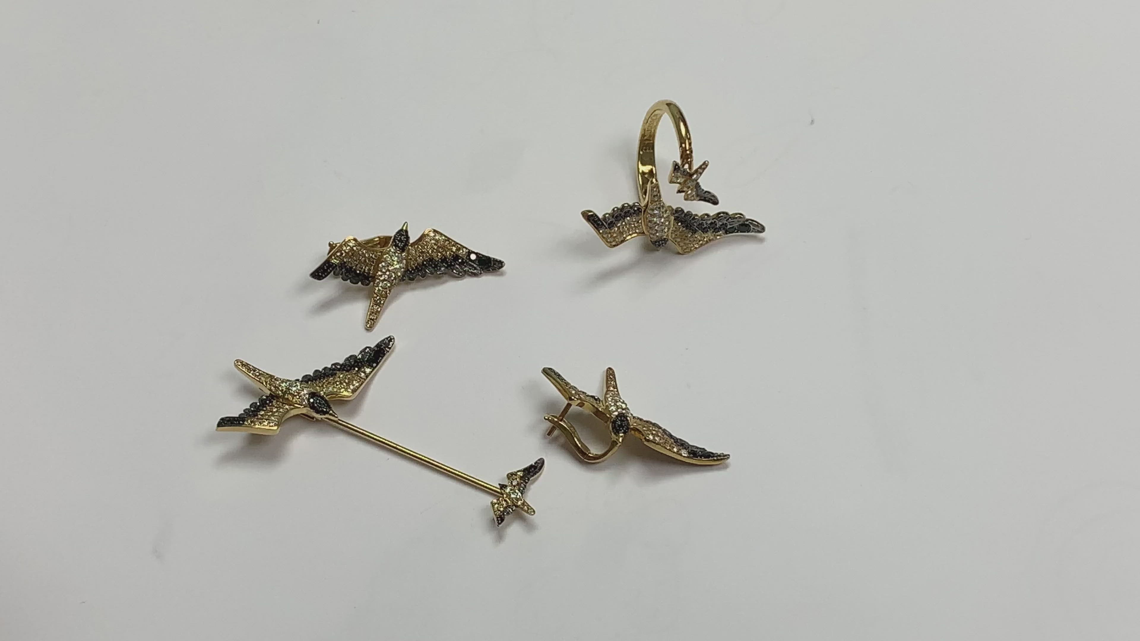 This ravishing 18 karat yellow gold ring, featuring captivating white and champagne diamonds, exudes an enchanting impression that the two seagulls adorning it are soaring through the air in unison. Reminiscent of gentle ocean breezes, this delightful ring will transport you to pleasant days spent by the seashore.