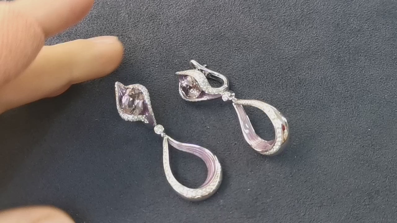 Introducing our new Earrings from so popular Melted Colors Collection. This collection is filled with all the colors of the rainbow. All stones are perfectly matched in color with enamel. Сolor of the enamel in these Earrings is precisely matched to the color of soft purple spinels weighing 4.72 Carat, with lines of diamonds fixed on the sides. Earrings for sensitive people.
