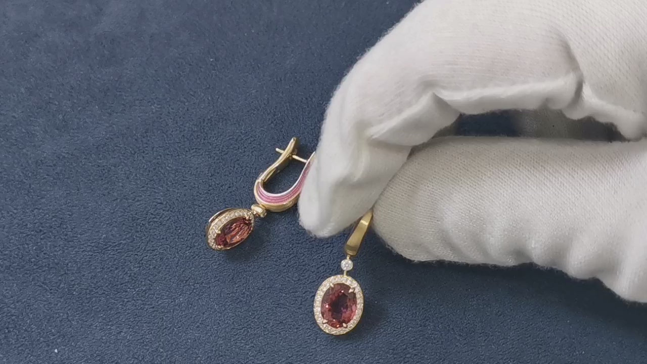 You'll feel like royalty with these beautiful Earrings. Made from 18 Karat Yellow Gold, encircled by 54 sparkling Diamonds and two Pink Tourmalines, and finished with glossy Enamel, these Earrings are sure to turn heads. Showcase your unique style and elevate any outfit with these majestic Earrings.