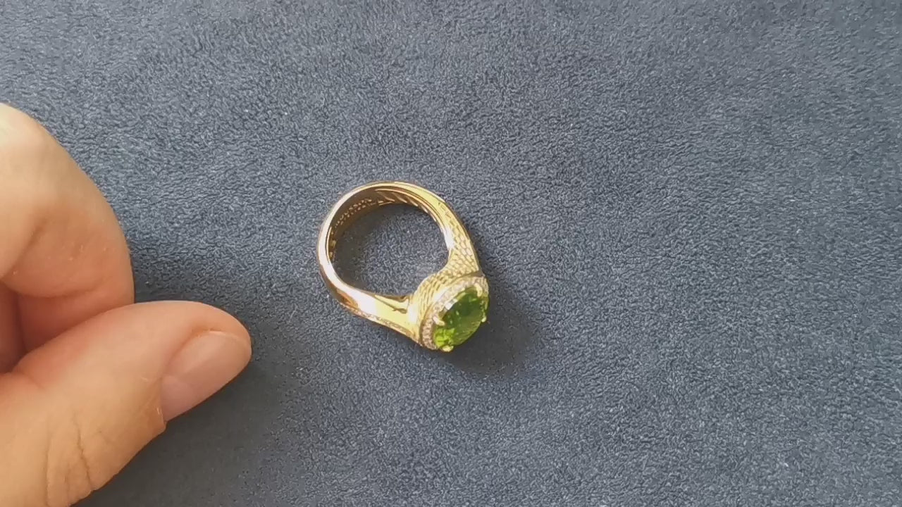 Introducing our 18 Karat Yellow Gold Ring, adorned with a stunning combination of  Peridot and 60 Diamonds. The true standout features, however, are the intricately textured shank and the base beneath the Peridot. Add a touch of uniqueness to your collection with the captivating "fishing net" pattern of this Ring.
