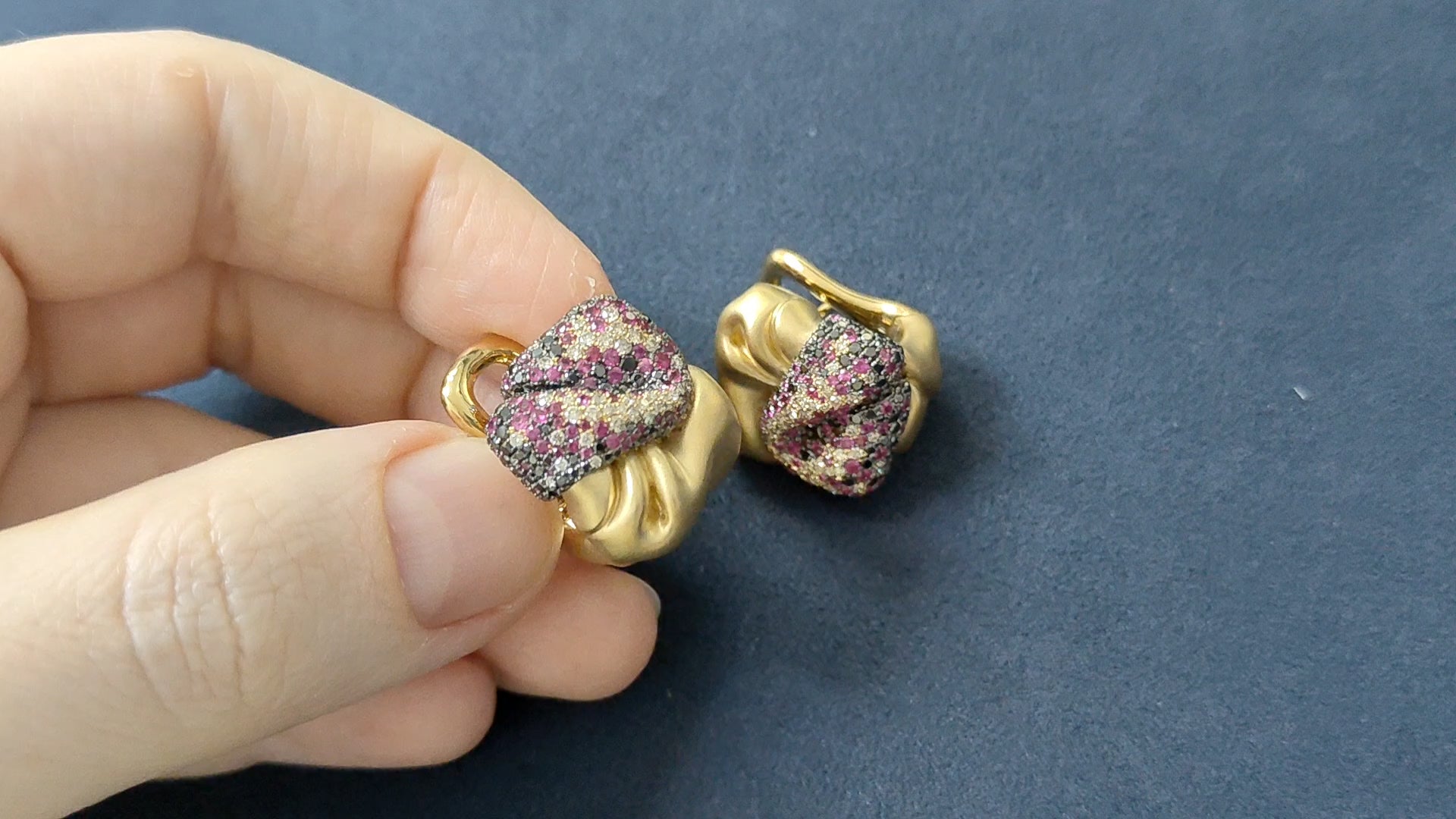 Our Silk collection is a celebration of motion and serenity. With our Earrings, we have manifested a crumpled fabric effect out of 18K matte yellow gold, adorned with black diamonds, rubies, and champagne diamonds that come together in an exquisite juxtaposition.