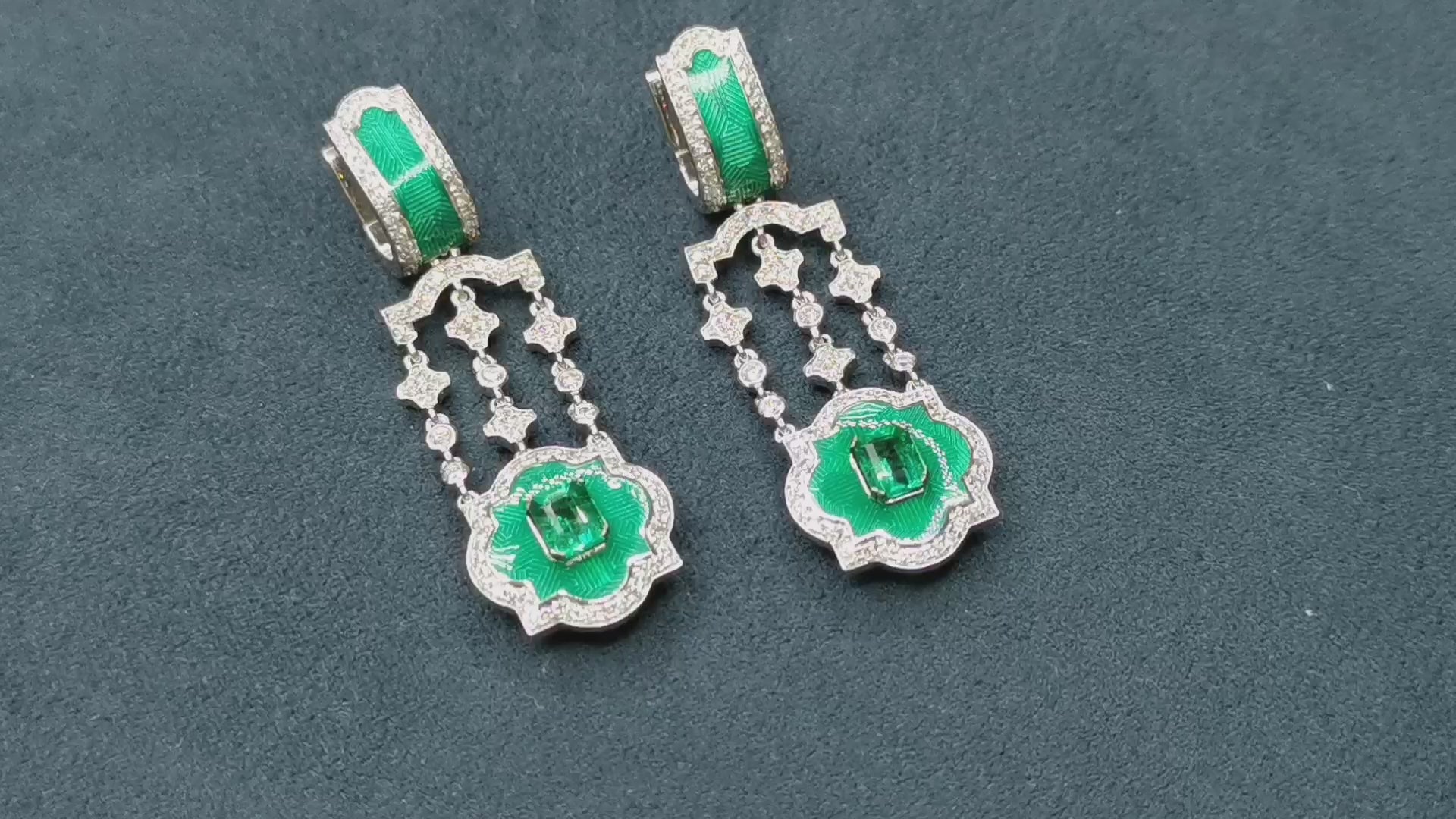 Take your style to the next level with these stunning earrings from the Tweed Collection. Made with 18K white gold, enamel, emerald, and diamonds, these earrings are the perfect accessory to elevate any outfit. You'll feel sophisticated and fashion-forward with every wear.