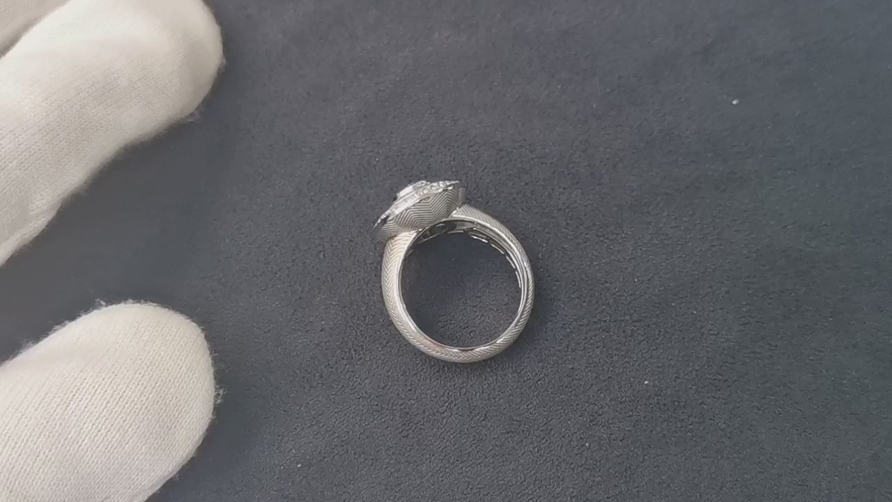 The guilloche technique is meticulously crafted by our masters to create a unique tweed-like texture on complex curved surfaces, making what was once impossible now attainable. The classic and daring design, adorned with Aquamarine, Diamonds, and Enamel, is truly a testament to the skill and artistry of Mousson Atelier.