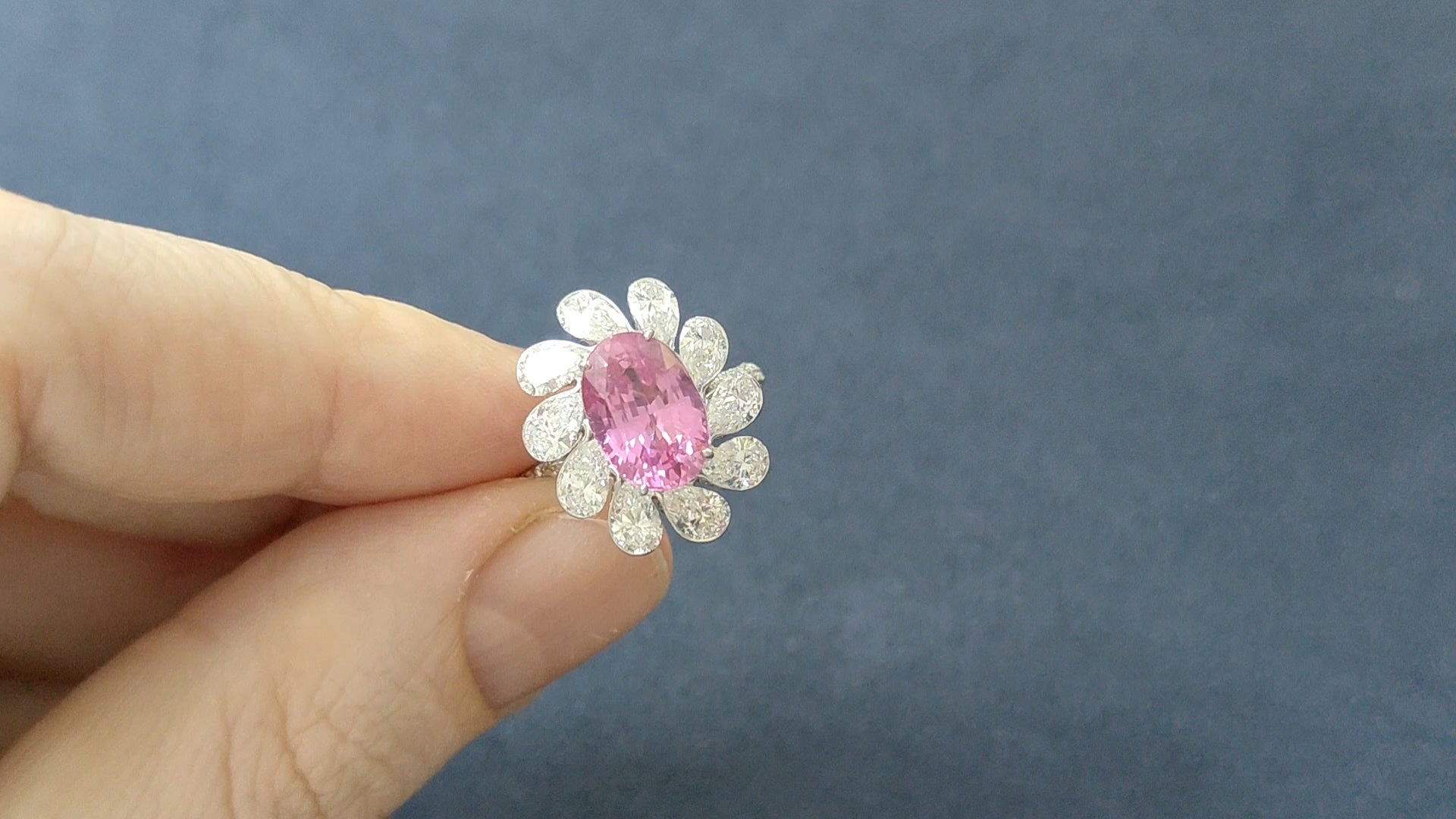 Prepare to be captivated by the latest addition to our "High Jewelry" Collection - a stunning ring featuring a GRS certified, No Heat Pink Sapphire as its central stone. Surrounding it are 10 pear-shaped diamonds, arranged like delicate flower petals. The shank of the ring is adorned with a scattering of countless diamonds, all set in 18K white gold for a light and ethereal look.